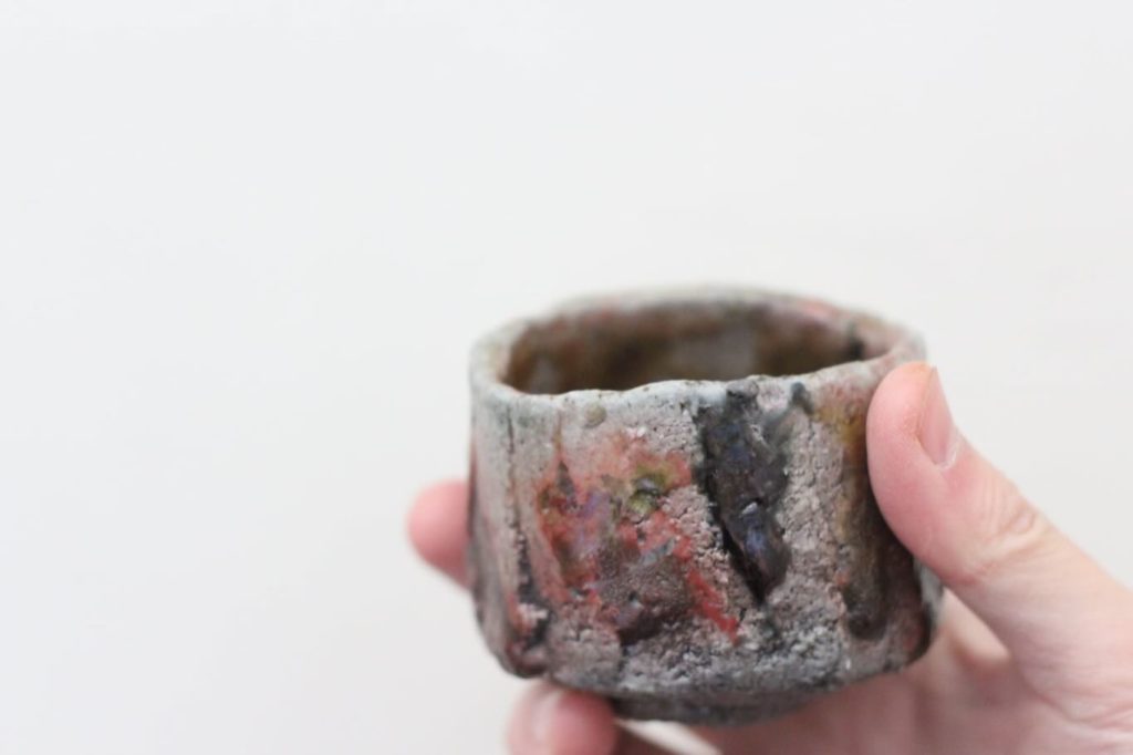 1・カラフルな盃は立体アート作品のよう。備前の土を使いながら釉掛けし、穴窯で「引出し」という技法で焼かれています。